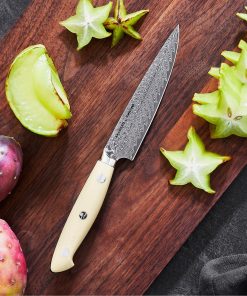 Made in Japan, these exceptionally durable knives are made with an SG2 super-steel core and are hand-finished using a traditional three step process. The cryogenic ice-hardened, 11° angle blade offers scalpel-like sharpness and will stay sharper, longer. Featuring an exquisite 101-layer, deep-etched chevron Damascus pattern, these revolutionary knives are true works of art.