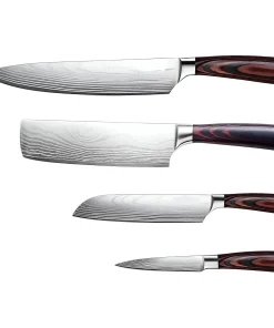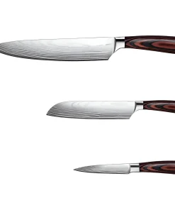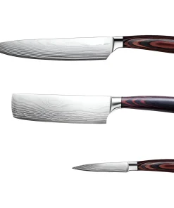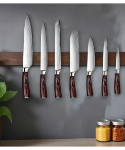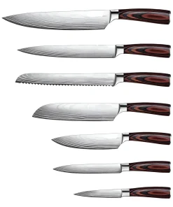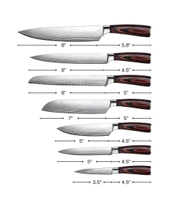 The black and brown wood seven piece cutlery set offers a comprehensive solution for your dining needs. Designed to serve seven, this knife cutlery set is perfect for gatherings and everyday meals. Crafted with a stunning damascus handle pattern, it exudes elegance and sophistication. Each piece is machine-made from high-quality stainless steel, ensuring durability and longevity. The transitional style combines classic and modern elements, making it a versatile addition to your table setting. The rich brown and silver color palette enhances its aesthetic appeal, making it suitable for any decor theme. Elevate your dining experience with this exquisite cutlery set that blends functionality and style seamlessly. 15-inch h x 5-inch w x 3-inch d.
