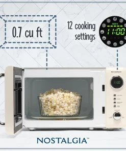 700-WATTS COOKING POWER : At 0.7 cubic foot, this microwave provides the cooking power needed to quickly cook and reheat foods CONVENIENT COOKING CONTROLS: 12 pre-programmed cooking settings, delay timer and express cooking provide options for the optimal heating of popular foods like popcorn, pizza, potatoes, veggies and more DIGITAL CLOCK : Easy-to-read LED display lights up the digital clock and highlights each cooking setting EVEN COOKING : Rotating glass carousel helps cook food evenly RETRO ACCENTS: A sleek chrome door handle, control panel and accents add fun and flair to this unique retro-styled appliance