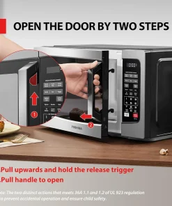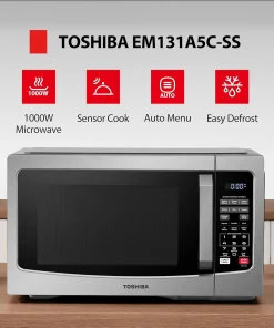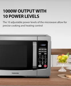 【Pre-programmed sensor menu】 for optimum heating of popular foods like pizza, potatoes, veggies and more; Power Wattage (Microwave): 1100W; Rated Voltage: 120V – 60Hz 【Stylish Appearance with Large Interior, fitting a 12inch Pizza】Black exterior, 20.51 x 17.14 x 12.83 inch (w x d x h); large 1. 2 cubic feet capacity, cavity 13.07 x 15 x 9.5 inch (w x d x h), removable turntable 12.4 inch (diameter) 【Other Functions】1100 watts with 10 power settings, defrost by time&weight, clock, and kitchen timer, One touch start for multiple food presets 【Practical Control Panel】Large digital display, easy-to-read control panel. The keypad was covered by a protective film during the shipment. Please peel it off before your first use. 【Mute Function】If you wish to mute the buzzer of the microwave, pleas long press on the button "8" for 3-5 seconds. The buzzer is automatically switched off after a long beep. Warranty 1 year, please keep the packaging for contacting Toshiba after service and product returns.