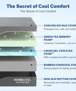 - Advanced Cooling Technology – Ice silk cover and cooling gel/tea foam layers work together to regulate temperature, preventing night sweats and overheating for uninterrupted sleep.