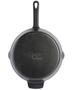 The Spice by Tia Mowry Savory Saffron 10-inch Preseasoned Cast Iron Skillet is a kitchen classic with a twist. This versatile cooking workhorse offers long-lasting durability and even heat distribution from its sturdy cast iron construction. Its robust handles feature ornate engravings that provide comfortable, anti-slip grips when cooking and serving. Perfect for frying, searing, baking, and more, this skillet has two side spouts for easy pouring of oils, sauces, and other liquids. Oven safe up to 500°F. Handwash only. Wipe dry immediately after washing and apply oil to prevent rust. Item Dimensions: 17.50" x 11.20" x 2.10" Item Weight: 5.90lbs