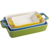 Constructed of sturdy stoneware, complete with rounded square edges and side handles, this set of baking dishes easily transitions from oven-to-table. Each set features 3 different colored 2-tone bakers which nest inside one-another for convenient storage. You’ll love baking your favorite dishes and serving your guests with this great bakeware set from 10 Strawberry Street. Dishwasher, oven & microwave safe.