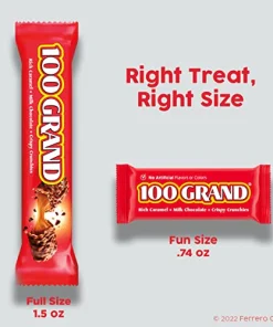 The crunchy goodness of 100 Grand Full Size chocolate candy bars comes perfectly packaged in this box of individually wrapped bars. These delectable Full Size candy bars with crispy crunchies, rich caramel and milk chocolate are a perfect-sized serving of this classic chocolate treat. This box of Full Size bars makes it easy to share at the office or at home for movie night. You can also bring one along to treat yourself for an on-the-go snack or anytime. 100 Grand candy bars are made with rich caramel, milk chocolate and crispy rice crunchies without any artificial flavors or colors. These 100 Grand Full Size chocolate bars are the perfect way to add a taste of luxury to your day.