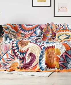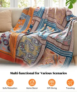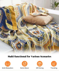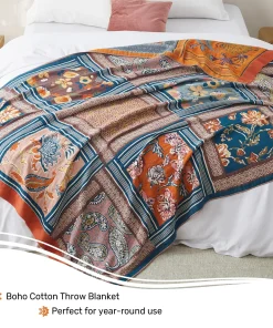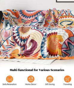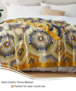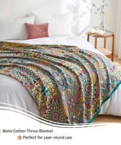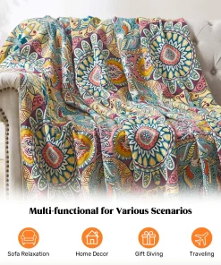 This cozy throw blanket is designed to add a touch of bohemian charm to your home decor. With its vibrant and lively colors, it captures the essence of a beautiful sunrise and brings the magic of bright colors into your living space. Featuring a blend of vintage-inspired design and contemporary edge, it offers a hint of nostalgia that is perfect for creating an inviting atmosphere. Crafted from buttery-soft cotton, it is lightweight, breathable, and exceptionally soft, ensuring comfort without making you too hot. Whether you’re cuddled up on the couch with a book, enjoying a picnic in the grass, or adding an extra layer of warmth to your bed, this blanket is the ideal companion for all your comfort needs. Its ethnic style and vibrant colors transform any living space into a warm and cozy haven, making it the perfect addition to your home decor.