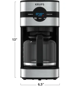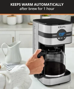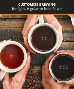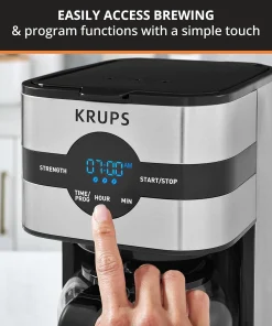 : With a generous brewing capacity of 10 cups, our coffee maker is the perfect choice for a household of coffee aficionados. enjoy more of the coffee you love. : Easily access the brewing functions and the 24-hour programming setting with the seamless digital touch-screen. : Choose from light, medium, or bold settings to adapt brewing parameters to your personal taste. : Our innovative pause & brew feature allows you to pour a cup mid-brew without spills or interruptions. coupled with the automatic 2-hour keep warm function, enjoy hot coffee exactly when you want it. & : Comes with a reusable coffee filter to minimize waste (no need for pods or paper filters), a measuring spoon, a dishwasher-safe no-drip carafe, and a simple on/off button. Savor the coffee experience, minus the hassle!Â