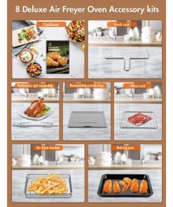 - 【 MULTI – FUNCTION TOASTER OVEN 】The Multifunctional air fryer toaster oven includes 10 versatile presets: Air Fry, Toast, Rotisserie, Dehydrate, Pizza, Roast, Bake, Broil, Cookies,defrost and two fan speeds. All-in-One Air Fryer Oven. This Convection Roast Oven with 100 Original Recipes, 6 Accessories kits included: Air fryer basket, wire rack, baking pan ,rotisserie spit, Fetch rack, removable crumb tray.