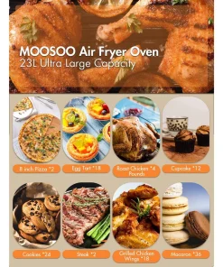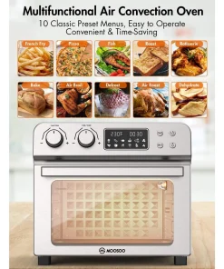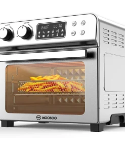 - 【STAINLESS STEEL & DISHWASHER SAFE】MOOSOO air fryer oven with user-friendly design and high-quality construction. It’ s equipped with stainless steel body, durable and easy to clean. You can check you meal easily with the interior light. Two Hi-speed airfry fan enable you cook meals with less time, fast cooking. All accessories are dishwasher safe.