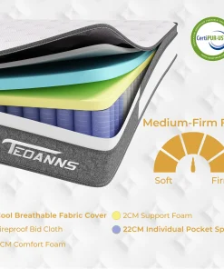 - 【Ensure A Peaceful Undisturbed Sleep】Teoanns mattress is made from individually pocket spring, they work independently from each other without worrying about collapse. It also reinforces the edge support and isolates motion transfer to a significant extent.