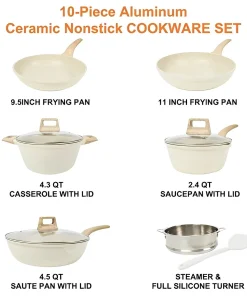 - Complete Culinary Arsenal: This all-inclusive set comprises 9.5-inch and 11-inch frying pans, a 2.3-quart saucepan with lid, a 4.3-quart casserole with lid, a 4.5-quart sauté pan with lid, a white silicone spatula, and a stainless steel steamer. Your kitchen will lack nothing.