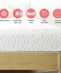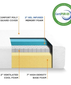 This gel memory foam mattress provides the ultimate rejuvenating experience while helping you sleep fresh with a cooling gel infusion. With thousands of gel beads and a layer of ventilated foam, this mattress works to help mediate trapped body heat while increasing ventilation and generating airflow. Memory foam’s pressure relief will bring you total relaxation, while providing the support you need in key areas throughout your body. The cooling gel memory foam and ventilated foam layers are supported by high density base foam for the perfect medium firmness. These layers are then wrapped in a comfort poly jacquard cover and packaged compactly to be delivered straight to your door. All our mattresses are made with CertiPUR-US certified foams and include a 10-year manufacturer’s warranty.