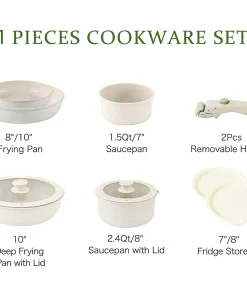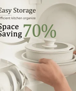 These pans, because the inner surfaces of these pans, without any rivets, are very smooth. The stackable, handle-free body allows these pots to fit in a small corner of the kitchen for super easy storage.
