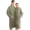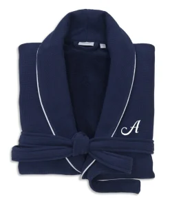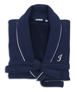 This navy blue robe is woven from soft, 100-percent genuine Turkish cotton in a waffle design on the outside with ultra-absorbent terry on the inside. Smartly styled with a white satin trim on the collar, cuffs and pockets, this sophisticated robe will keep you immensely dry and exceptionally comfortable. Features two large front pockets, a removable belt and a white embroidered initial of your choice.