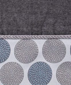 The Avanti Dotted Circles Nickel Bath Towel features a jacquard woven border with medium grey and slate blue circles and metallic accents, finished with a matching grey rope trim. The 100% cotton nickel velour towel measures 27" x 50". Coordinating accessories, rug, shower curtain available.