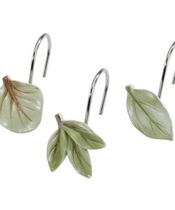 The Avanti Ombre Leaves 13-Pc Shower Curtain & Hook Set features a curtain with a tossed botanical design in green, beige and blue. Printed on a 52% polyester/48% cotton textured base cloth with ombre ground. Set includes a 72" x 72" curtain and 12 resin hooks, 4 of each of 3 leaf designs.