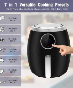 - 【Time/Temp Touch Control with LCD Display】: Intelligent digital panel with touch control, all kinds of cooking methods at a glance, easy to understand. Seven menus switch easily – Chicken, French fries, Steak, Shrimp, Cake, Fish, Meat.The LCD panel at the top and the surrounding cooking presets form a ring Making the air fryer whole more design sense. The classic black body makes it more resistant to dirt in the kitchen.
