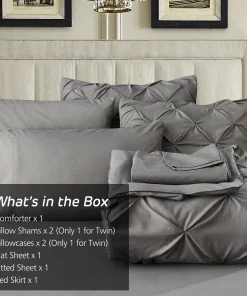1 x pinch pleat comforter 90”x90”, 1 x flat sheet 90”x102”, 1 x fitted sheet 60”x80” 14”, 1 x bed skirt 60”x80” 15”, 2 x pillowcases 20”x30”, 2 x pinch pleat pillow shams 20”x26”.