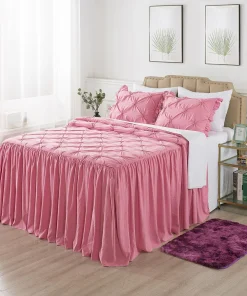 Add elegance to your bedroom decor with the JML 4 PCS Ruffle Skirt Bedspread Set. With a classic drop ruffled style and a beautiful 30-inch drop, this bedspread is designed to provide a luxurious presence in your bedroom. The pintuck design evenly spreads out across the bedspread, and each pintuck is carefully arranged to offer a pinch tuck design that screams luxury. Made of ultra-soft-brushed microfiber with high thread count, this bedspread is both comfortable and durable. The 200 GSM premium fluffy filling (120GSM filling on surface while 100GSM on backside.total 420 GSM) provides ultimate softness and warmth, making it an ideal quilt for cold weather. This bedspread set includes a fluffy rug for a complete and elegant look.