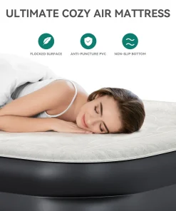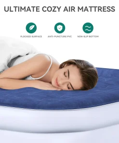 - Luxury Comfort: Crafted from high-quality durable PVC and skin-friendly flocked top layer, this blow up mattress is water resistant and easy to clean. The soft plush surface of queen mattress promotes quick and comfortable sleep, fostering healthy sleeping postures for a luxurious experience throughout the night