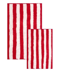 Large 2 Piece Set Red White Stripe Soft Cozy Plush Chenille Bath Mat Bathroom Rug