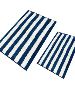 Large 2 Piece Set Blue White Stripe Soft Cozy Plush Chenille Bath Mat Bathroom Rug
