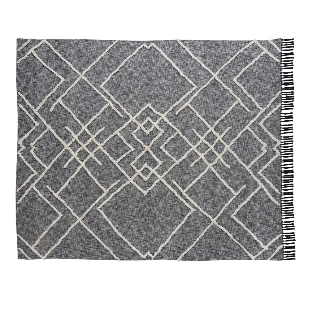 Charcoal and Off White Geometric King Cotton Coverlet With Fringe