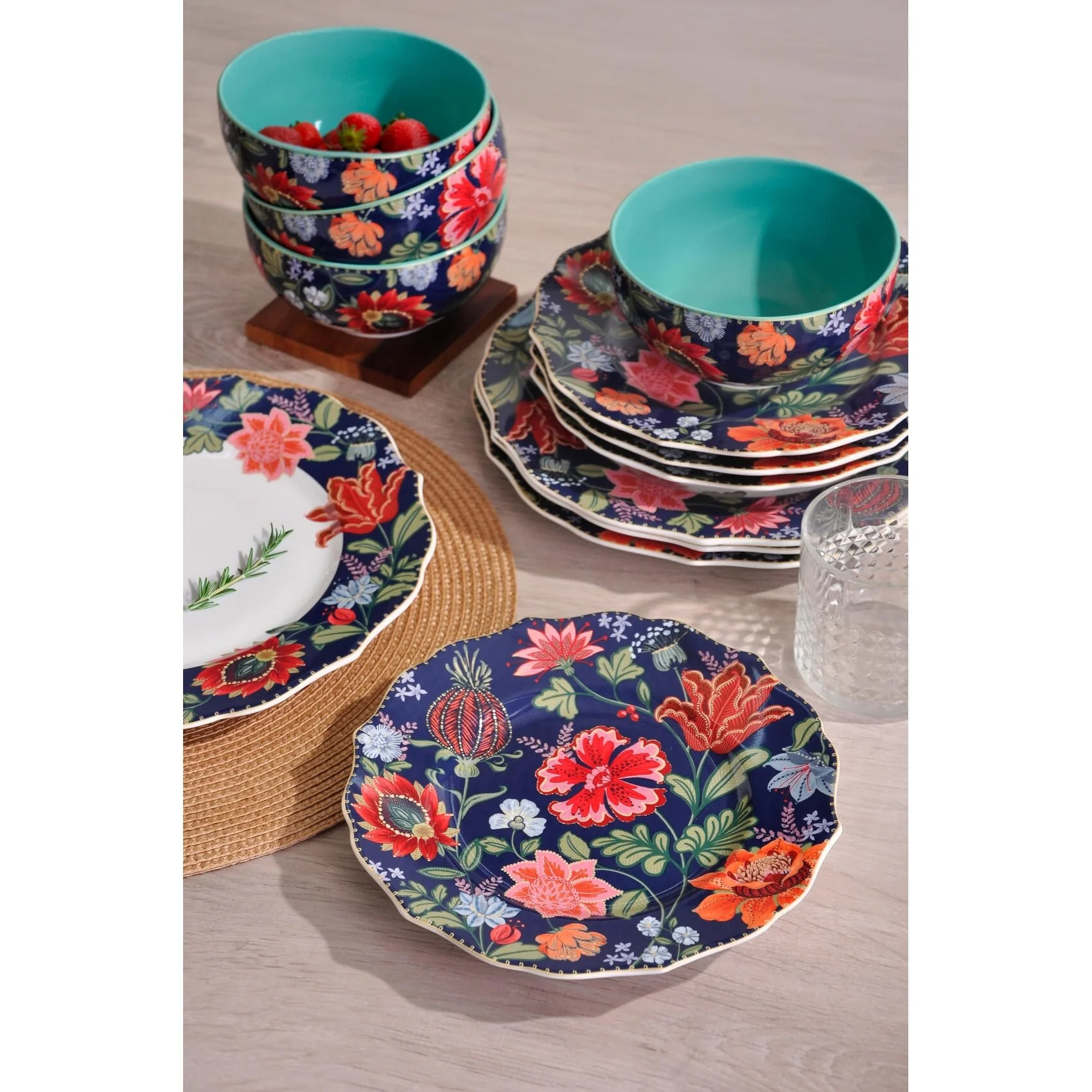222 Fifth Chintz 12-Piece Blue Porcelain Dinnerware Set – Service for 4, Plate & Bowl Set