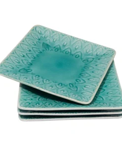 Euro Ceramica Peacock 4 Piece 6.5" Square Appetizer / Canape Plate Set in Lagoon – 6.5 in. x 6.5 in. x 0.8 in.