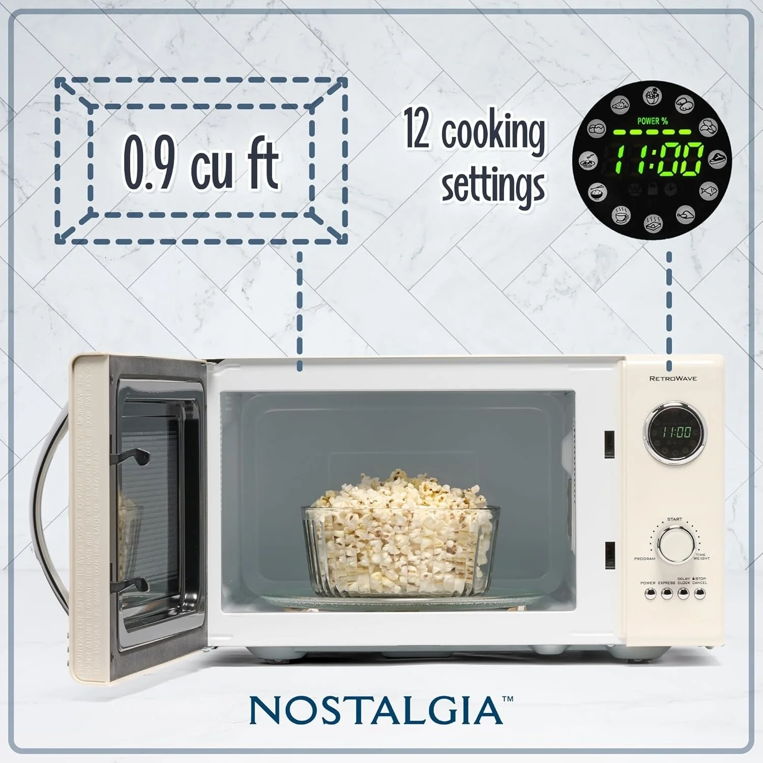 CONVENIENT CONTROLS: 12 pre-programmed cooking settings, a delay timer, and express cooking provide options for the optimal heating of popular foods like popcorn, pizza, potatoes, veggies, and more.