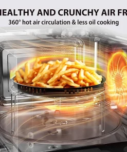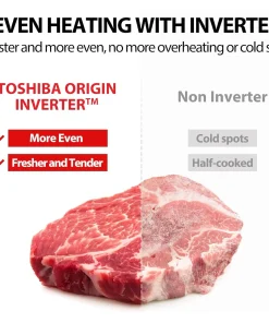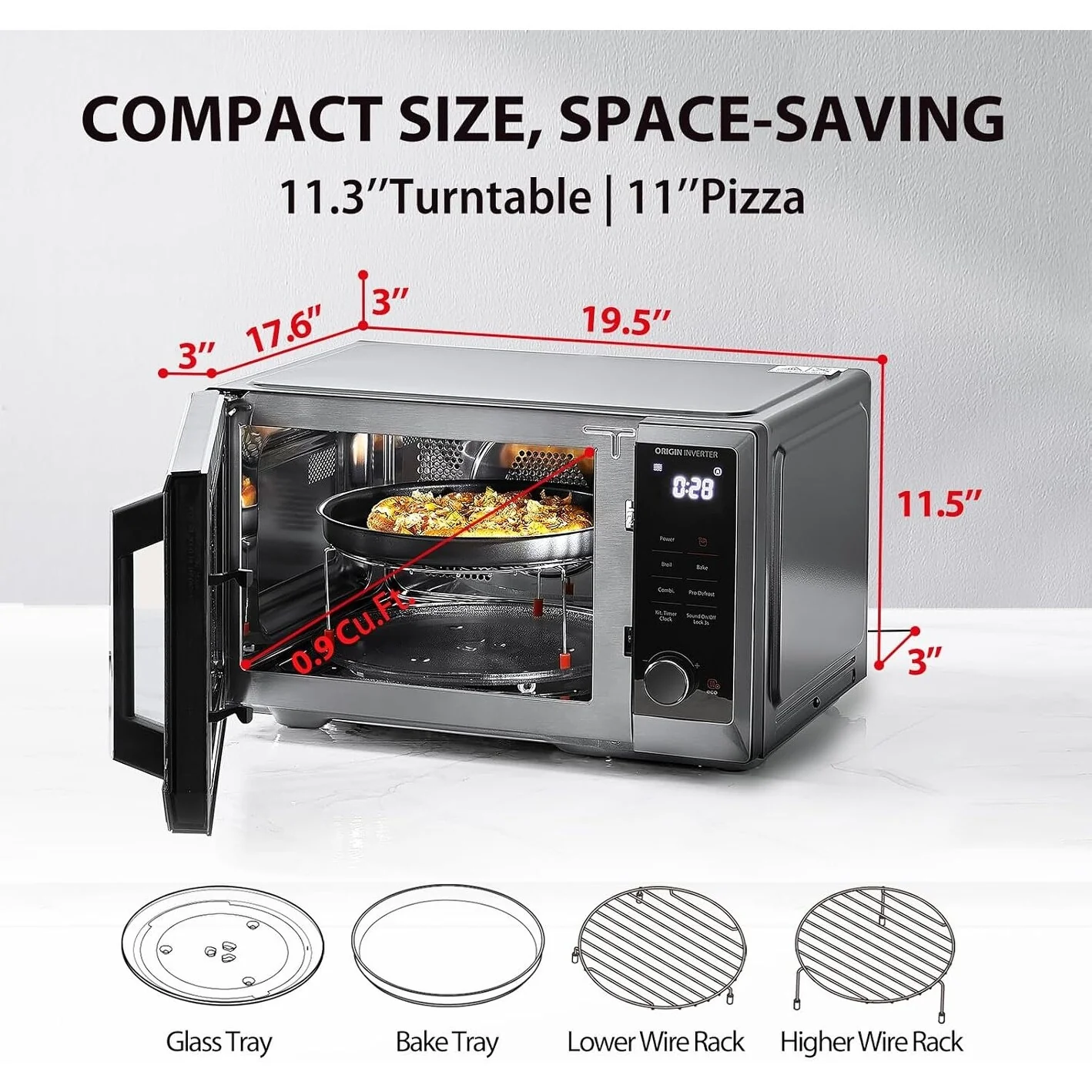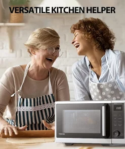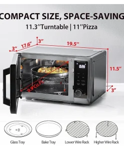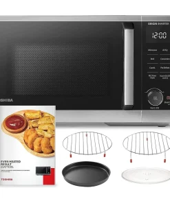 【6-In-1 Ultimate Versatility】This multi-microwave with 10 power levels is your ultimate kitchen helper. The versatility as a microwave, air fryer, convection oven, broiler, defroster, Speedy-Combi, make it your best countertop space-saver 【Inverter Technology for Even Cooking & Defrost】TOSHIBA ORIGIN Inverter Technology allows more uniform distribution of heat in cavity, provides even cooking, reheating and defrosting, the maximum tender texture. Also the 50dB working noise level brings you and your family a quiet and undisturbed cooking environment. 【Less Fat and Crispier】TOSHIBA convection microwave with 360° heat circulation air fry cuts down on calories by using no added oil while delivering crispier and golden fried food like chicken nuggets, fried fish and French fries. The supplied bake tray and two wire racks are used for optimal air fry results. NOTE: Please use convection mode if need to customize timing and temperature, functions equally as air fryer. 【Speed up Cooking with Combi-Modes】Despite powerful output of 1800W under Convection up to 425°F and 1000W under Grill, Combi-Modes speed up your cooking with combination of Microwave, convection and grill function, while delivering perfect dishes with crispy, browned outsides and tender texture insides. 【Discover Amazing Recipes】Comes with an original cookbook with 27 classic recipes. Also, the microwave itself has 11 Auto Menus, 10 Air Fry Menus and 6 Defrost Presets, so that novice can also make Michelin-star meals at home. External Dimension: 19.5”W x 17.6”D x 11.5”H with 11.3” turntable.