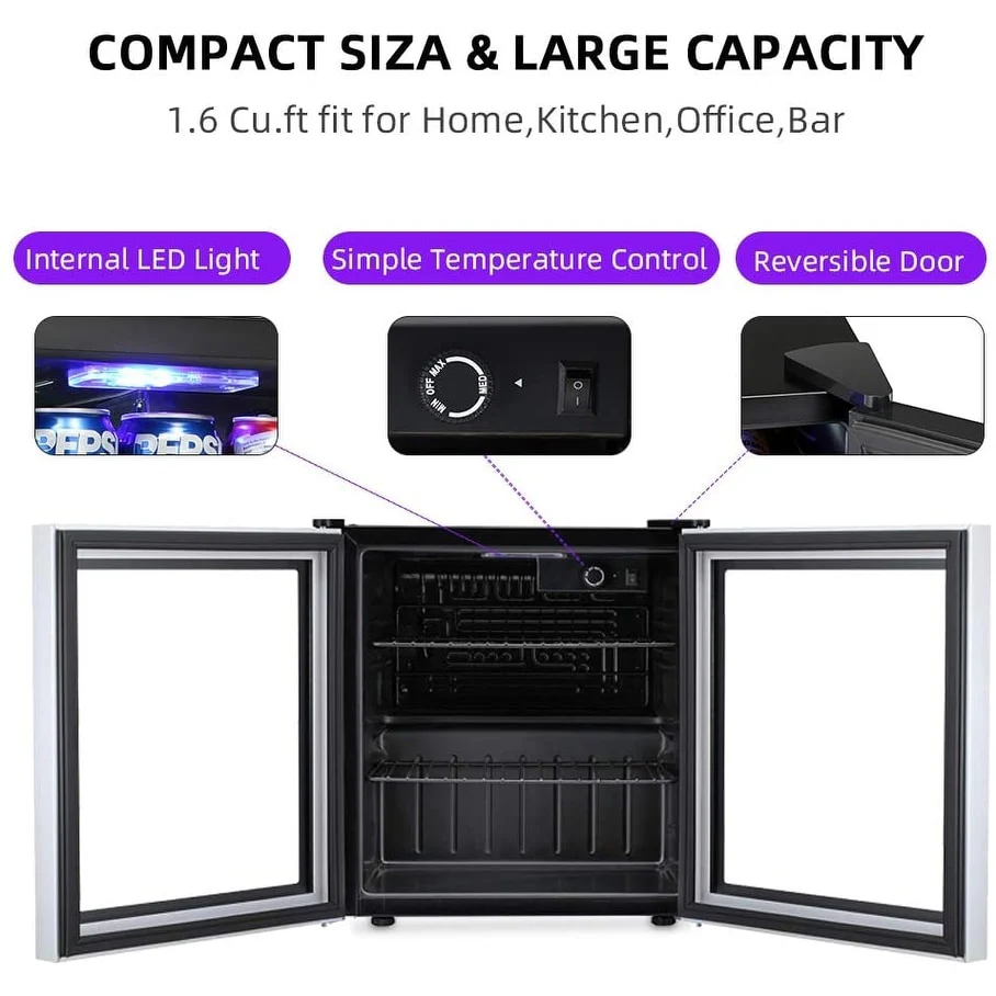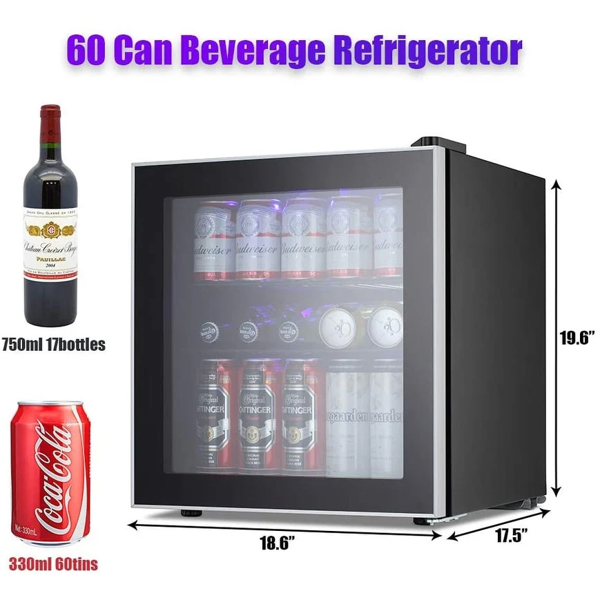 - 【Compact Size but Large Capacity】This 1.6 Cu.ft beverage refrigerator has a large capacity with compact size 18.6(L)*17.5(W)*19.6(H) inch,can accommodate 60 can beverage or 17 bottles White or red wine.Works perfectly in home,kitchen,office,dorm room or at any event.