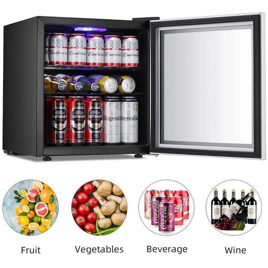 - 【Modern Electric Beverage Cooler】 The powerful compressor based cooling system ensures cool quickly and no noise.It only emits less than 40 db volume during operation.The soft blue LED light making it easier to find your favorite chilled drink at night time.The shelf is removable can control the interior space to meet various needs of drinks height.