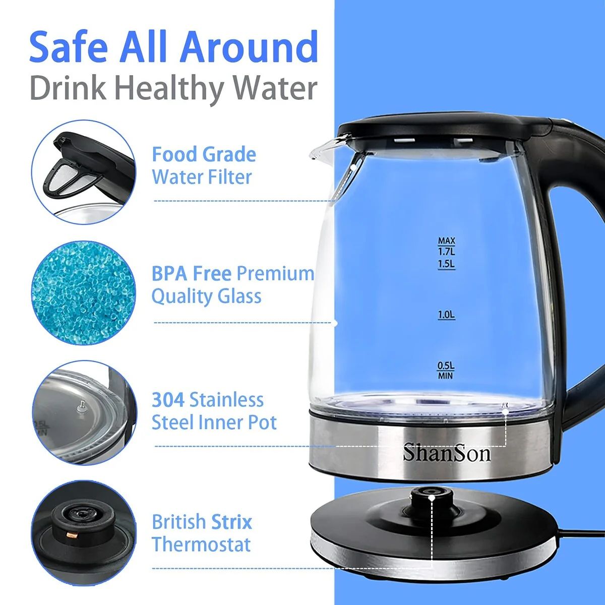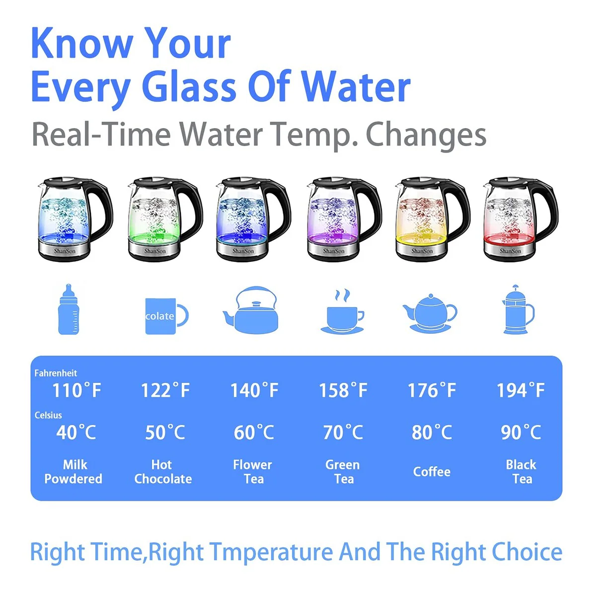 【Fast Boiling & LED Indicator】Electric Tea Kettle With 1500 watts, the glass electric kettle can boil up to 1.7 L water in 3-7 minutes, allowing you to enjoy tea, coffee, oatmeal,hot chocolate, milk powder and more. Different color for indicating different temperatures: 110℉( light blue),122℉(green), 140℉(dark blue),158℉(purple) ,176℉(yellow), 194℉(Red), boil-212℉(Completion tone)