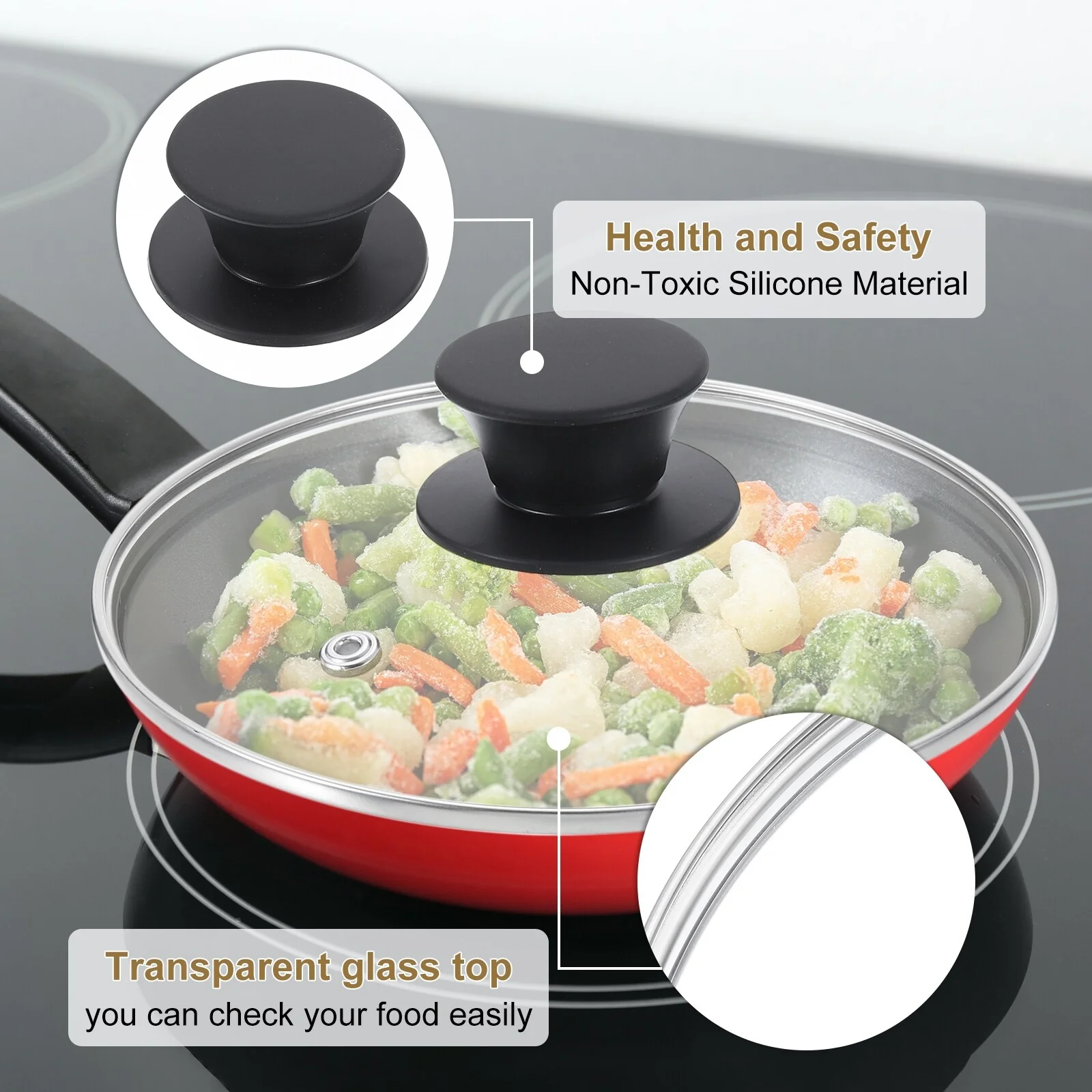 - [Clear Design]: The clear glass lid is very suitable for checking on your food while cooking. It lets you watch your food cook without opening the lid, giving you a better idea of cooking time. The lid’s steam hole releases excess moisture to prevent spills.