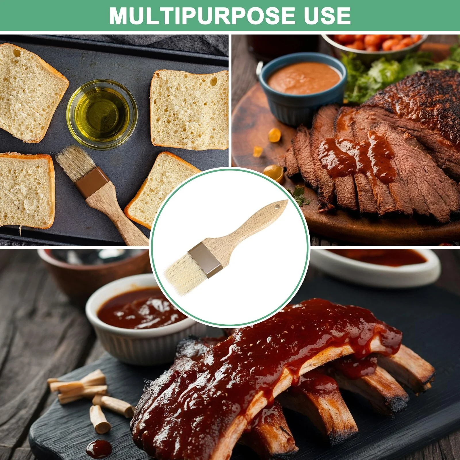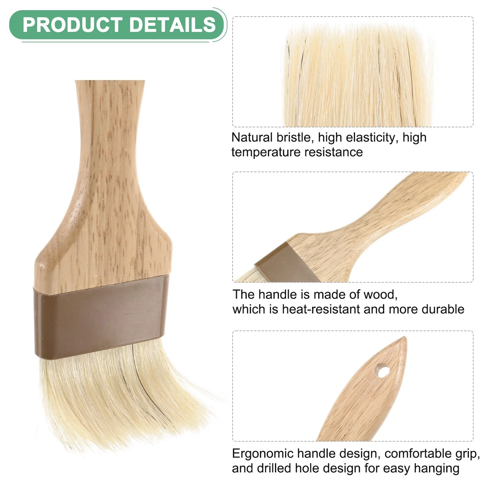 1. The butter brush is made of natural bristles, which are highly elastic and resistant to high temperatures. It can quickly return to its previous shape after bending and is not easily deformed. It can adapt to temperatures of -104℉-660℉ (-40℃-315℃), and the bristles will not fall off in food, allowing you to feel more at ease when cooking.