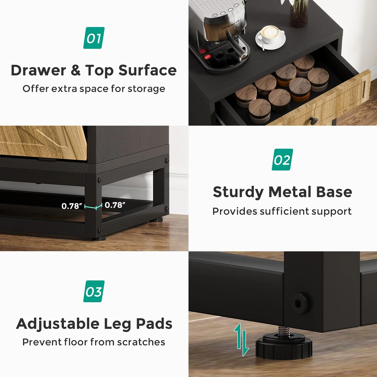 【Large Storage Capacity】: The bottom features a tilted trash bin space for a 10-gallon trash can, perfectly concealing garbage to avoid the pets accidentally knocking over the trash bin. The upper drawer and countertop provide additional storage space for storing a coffee maker, juicer, knives, forks and so on.