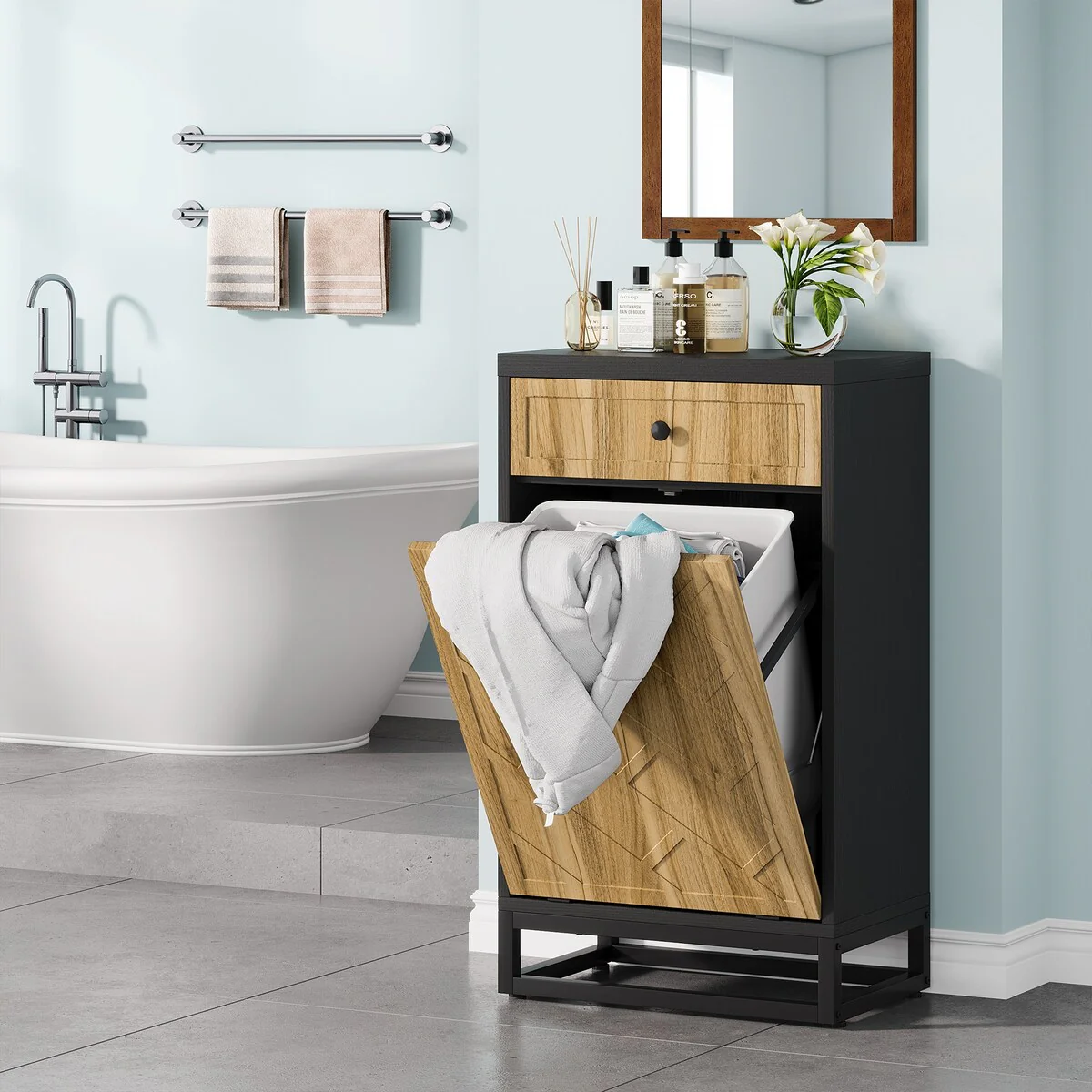 【Multi Purpose】: This trash bin cabinet is not only suitable for the kitchen but also meets the needs of dining rooms, laundry rooms, living rooms etc. Whether it’s storing trash bins, dirty clothes, or pet food, it handles everything with ease.