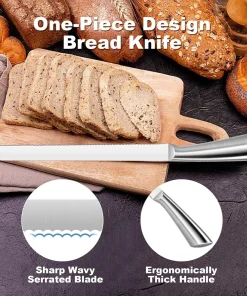 - Precision Serrated Blade: Our 10-inch bread knife features a razor-sharp serrated blade crafted from high-quality stainless steel, ensuring effortless slicing of bread, cakes, pastries, and more with precision and ease.