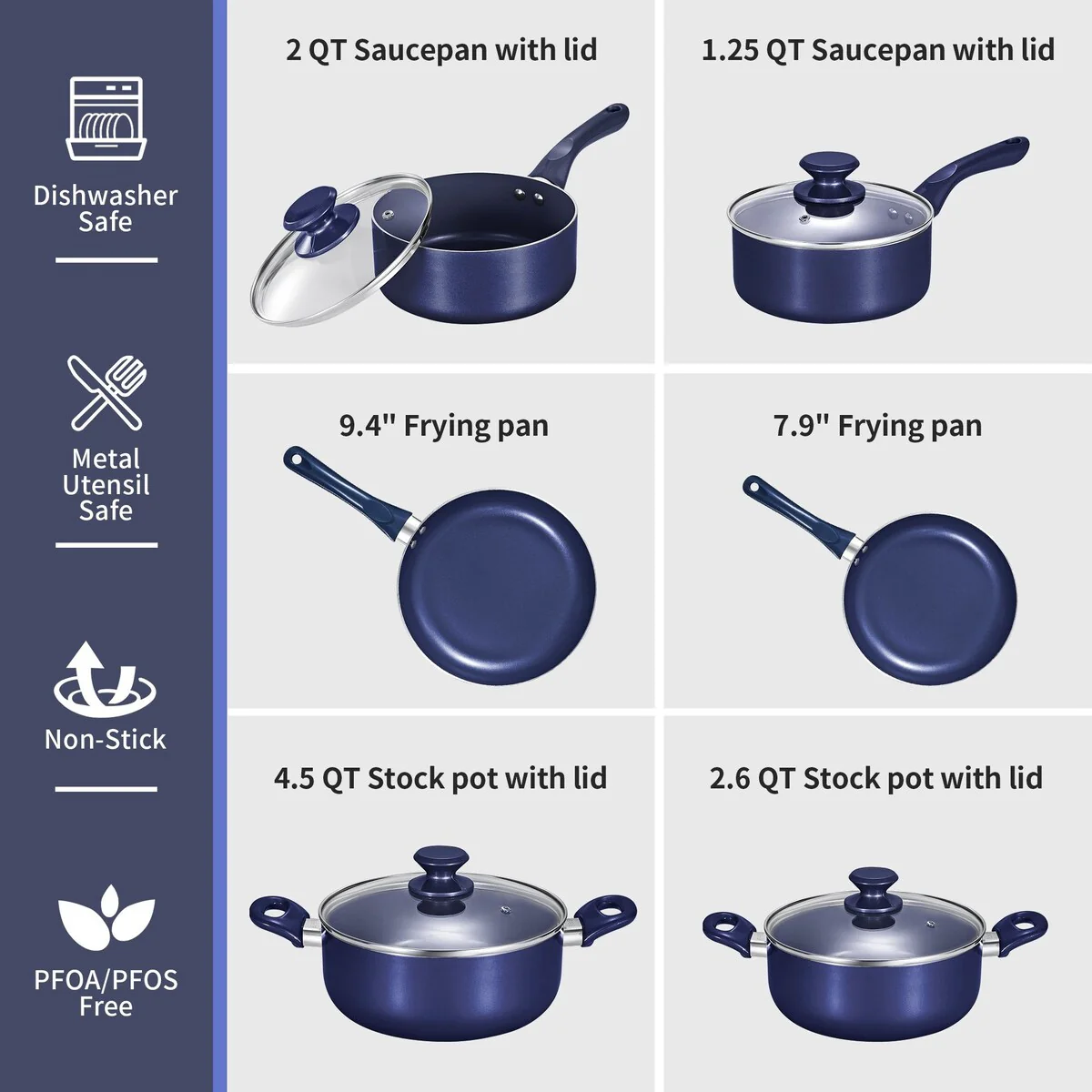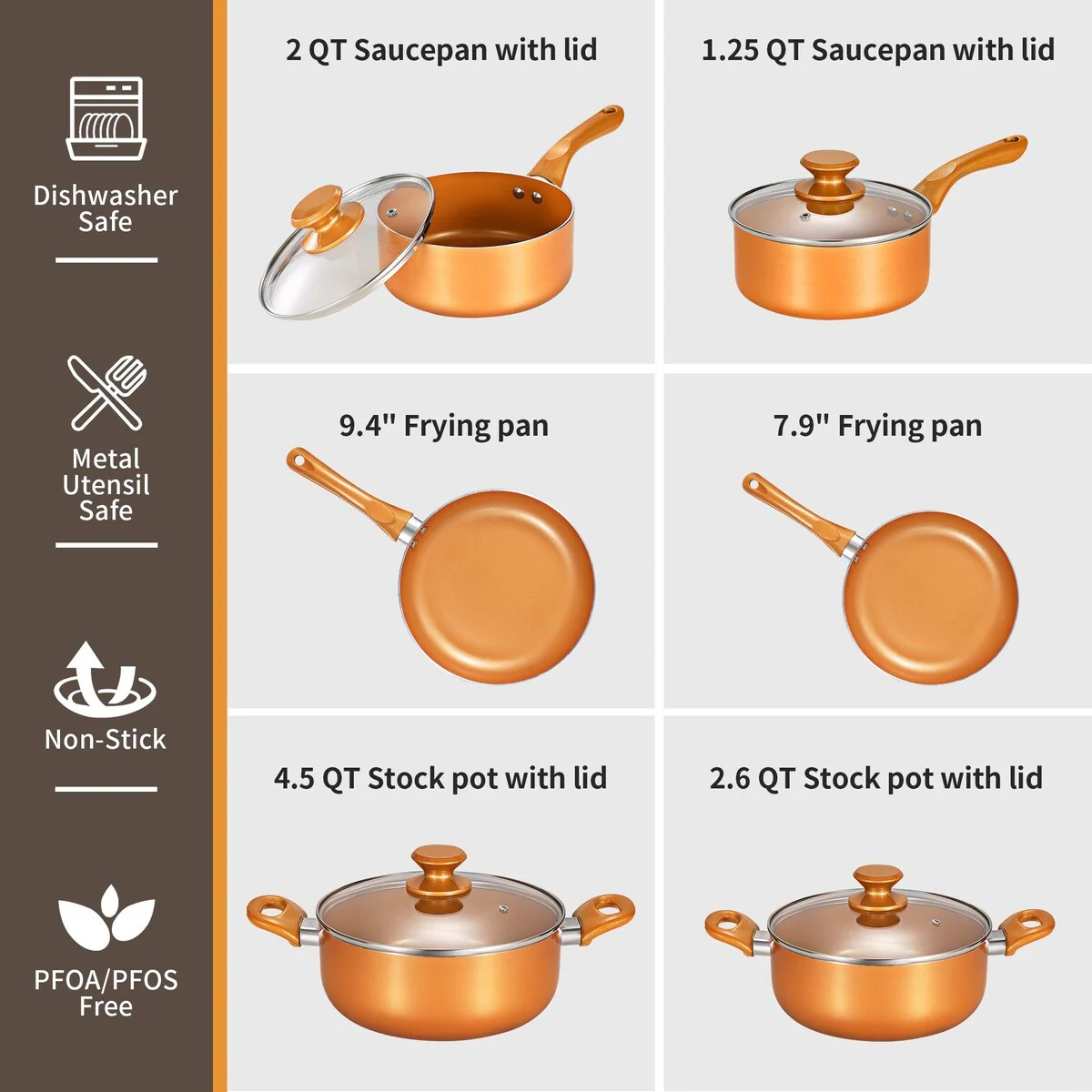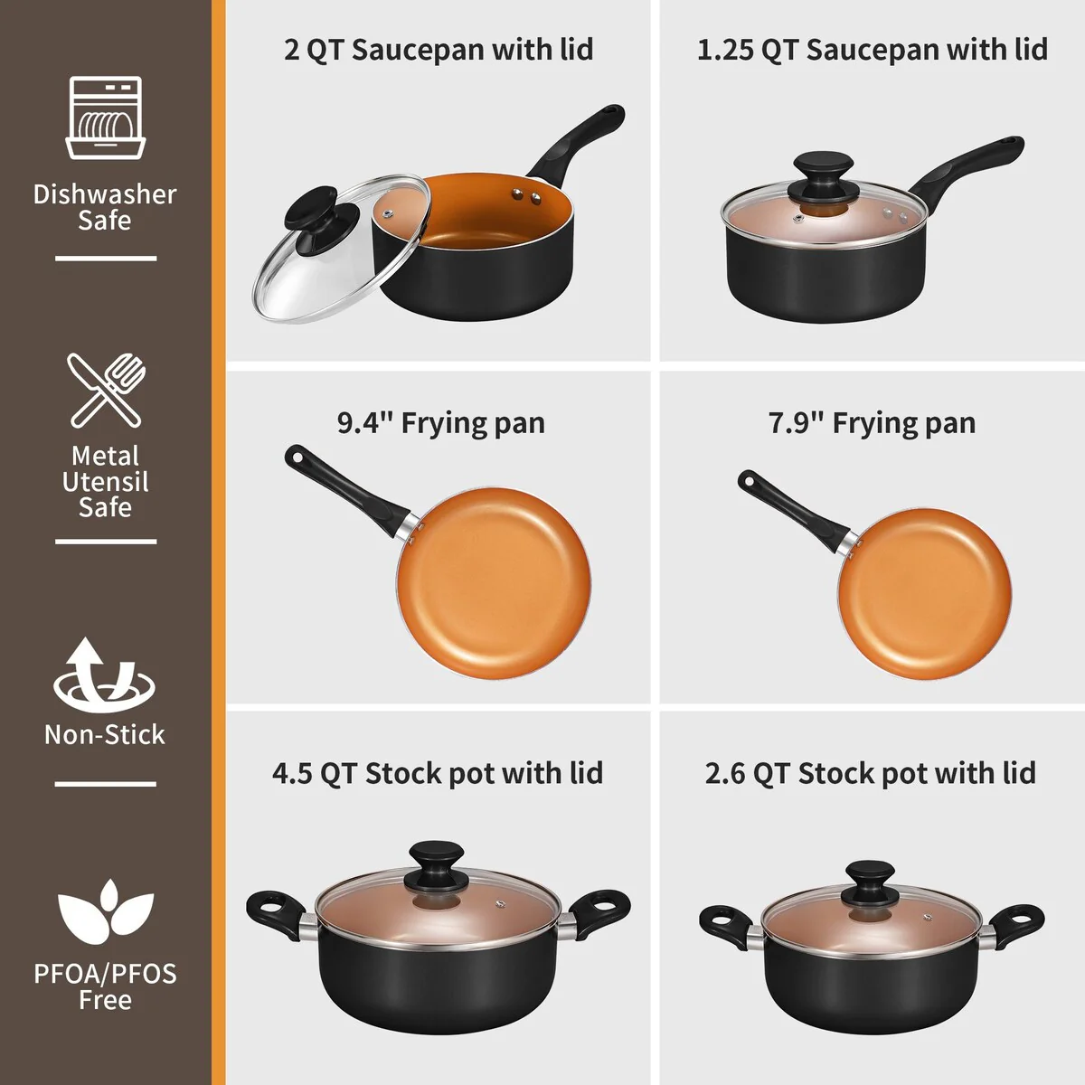 Package Included:1 x 8-inch skillet, 1 x 9.5-inch skillet, 1 x 1.2 quart saucepan with lid, 1 x 2 quart saucepan with lid, 1 x 2.6 quart stockpot with lid, 1 x 4.5 quart stockpot with lid