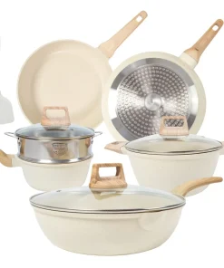 Discover a new realm of culinary possibilities with the SUGIFT 10-Piece Nonstick Cookware Set. Crafted with an eco-friendly White Granite surface, this cookware set offers unparalleled non-stick performance for healthier and more convenient cooking. From sizzling skillets to versatile saucepans, this comprehensive collection has you covered for any culinary adventure. Featuring an extended bottom design, the set is compatible with all stove types—including induction cooktops. Say goodbye to laborious cleaning; a simple wipe or rinse is all you need.Â