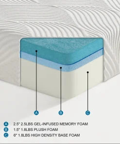 Our 10-inch mattresses feature a triple layer construction that consists of: 2.5-inch gel-infused memory foam, 1.5-inches of plush foam and 6-inches of high-density base foam – and are offered in Twin, Full, Queen, Eastern King, California King.