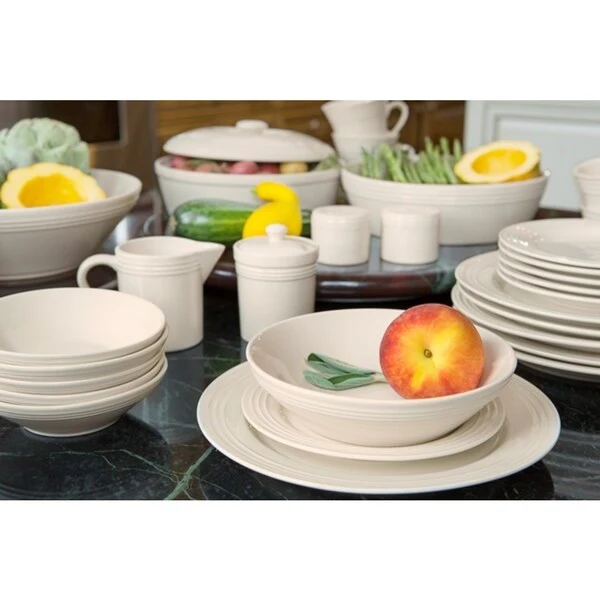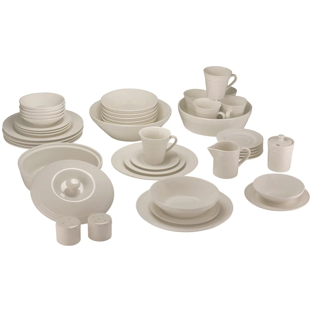 The Atlas 45-piece dinnerware and serveware set includes all the pieces you need to get your kitchen started. Featuring microwave and dishwasher safe porcelain, the set includes: dinner plates, salad plates, bowls, cups, saucers. sauce dishes, salt and pepper shakers, creamer and sugar bowl set, serving bowl, covered casserole dish and baking dish. In classic ivory, this tableware provides classic elegance for your next meal.Â