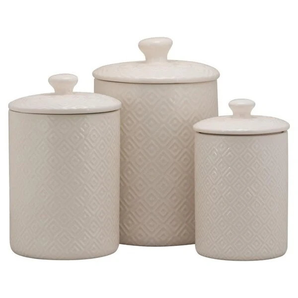 Decorated with a fun mix of lush florals and geometric patterns, this 3 piece canister set is a stylish addition to any kitchen—both decorative and functional! Perfect for storing your countertop staples like flour, sugar, coffee or tea. Set includes 1 x 24 oz small canister 3.75"L x 3.75"W x 5.5"H; 1 x 38 oz medium canister 4.5"L x 4.5"W x 6.25"H; 1 x 108 oz large canister 5.5"L x 5.5"W x 7.5"H.