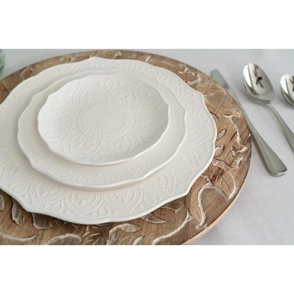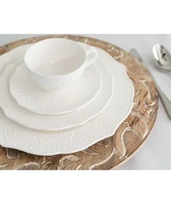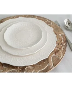 Graceful and elegant, the Dahlia collection adds sophistication to any table setting. With an embossed pattern and beautiful scalloped edges, this porcelain dinnerware transitions perfectly from everyday use to special occasion. Set of six 6" bread & butter plates.While dishes are microwave-safe, they may become hot. Handle carefully.