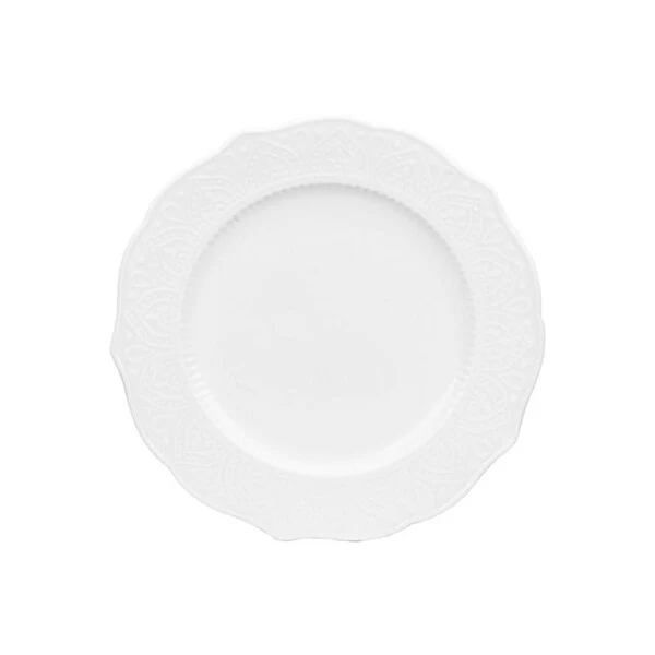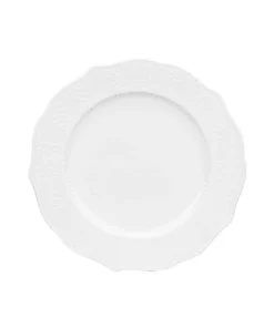 Graceful and elegant, the Dahlia collection adds sophistication to any table setting. With an embossed pattern and beautiful scalloped edges, this porcelain dinnerware transitions perfectly from everyday use to special occasion. Set of six 7.75" side plates. While dishes are microwave-safe, they may become hot. Handle carefully.
