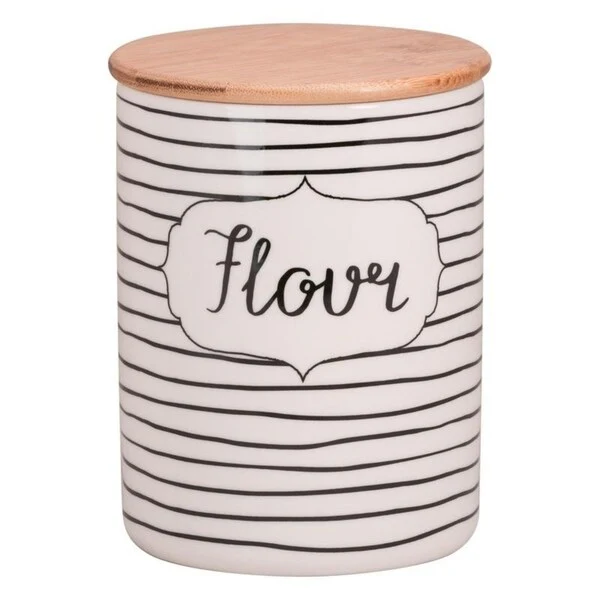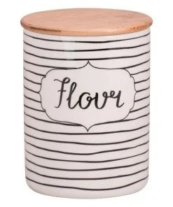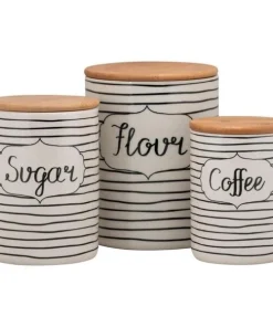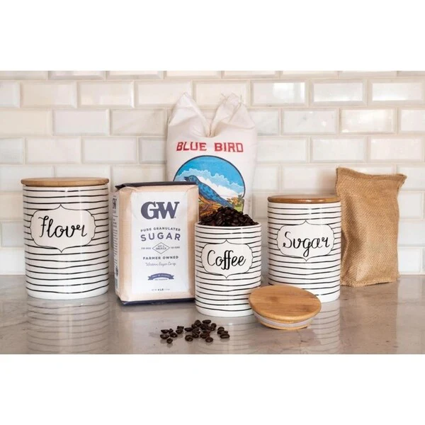 Store countertop staples in style with this 3 piece canister set. Finished with a bamboo lid that has a silicone gasket to form a tight seal, these canisters are perfect for storing exactly what each one says: sugar, flour, and coffee. Set includes 1 x 24 oz Coffee canister 3.75"L x 3.75"W x 5.5"H; 1 x 38 oz Sugar canister 4.5"L x 4.5"W x 6.25"H; 1 x 108 oz Flour canister 5.5"L x 5.5"W x 7.5"H.