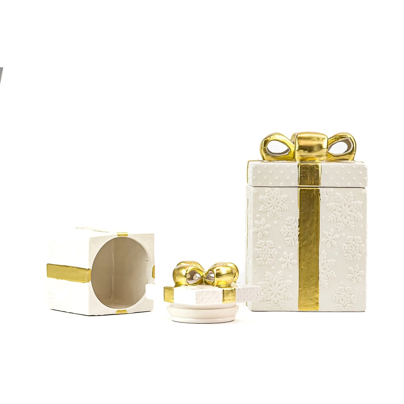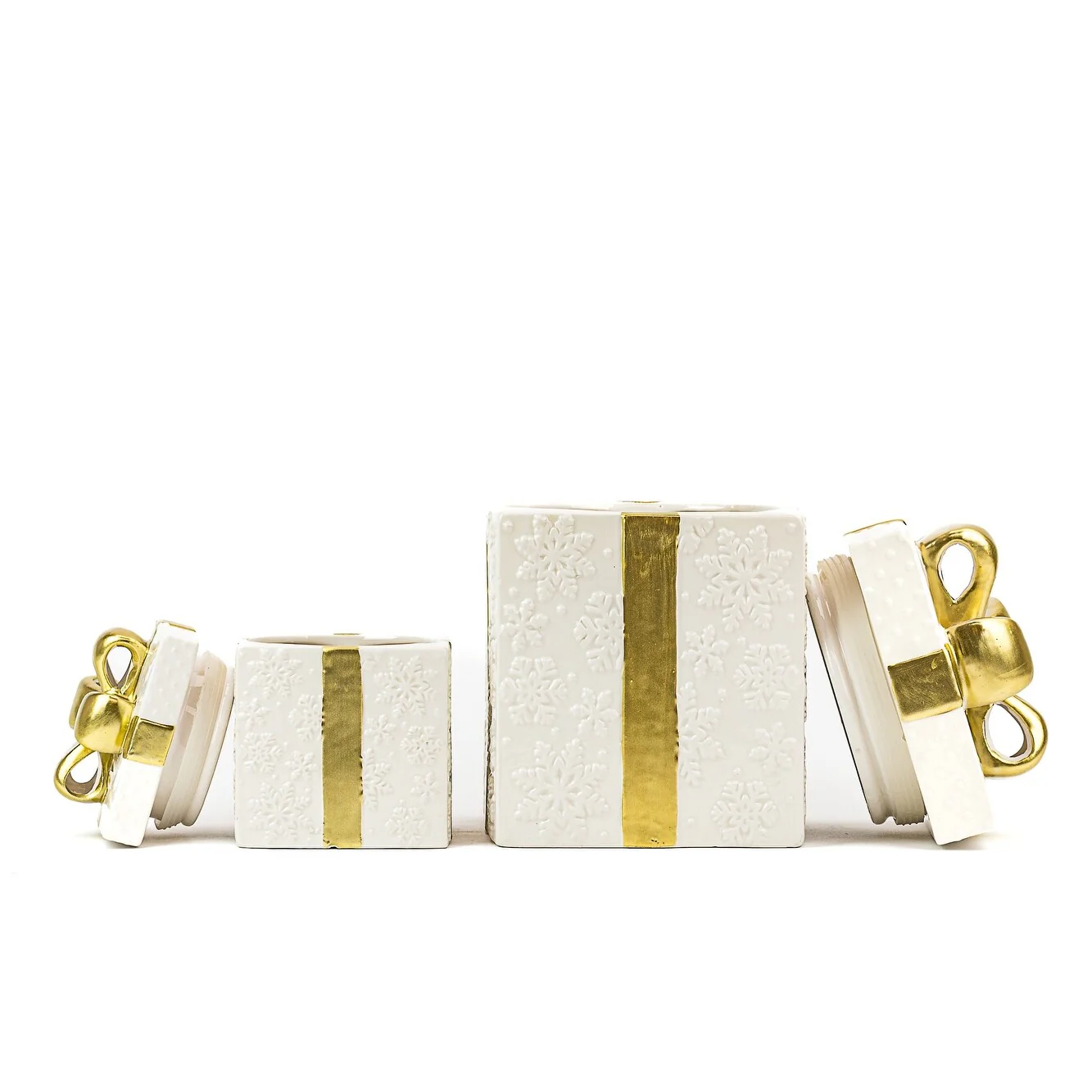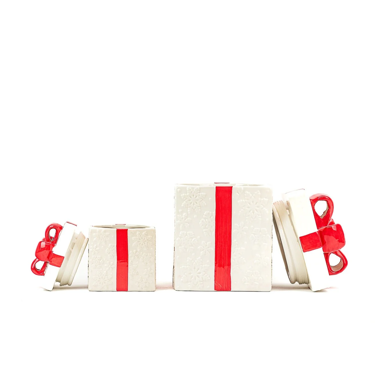Add festive charm to your kitchen with this set of cookie jars shaped like holiday boxes, topped with a decorative ribbon. Perfect for storing seasonal treats or enhancing your holiday decor, these jars bring a stylish & cheerful touch to any space.t