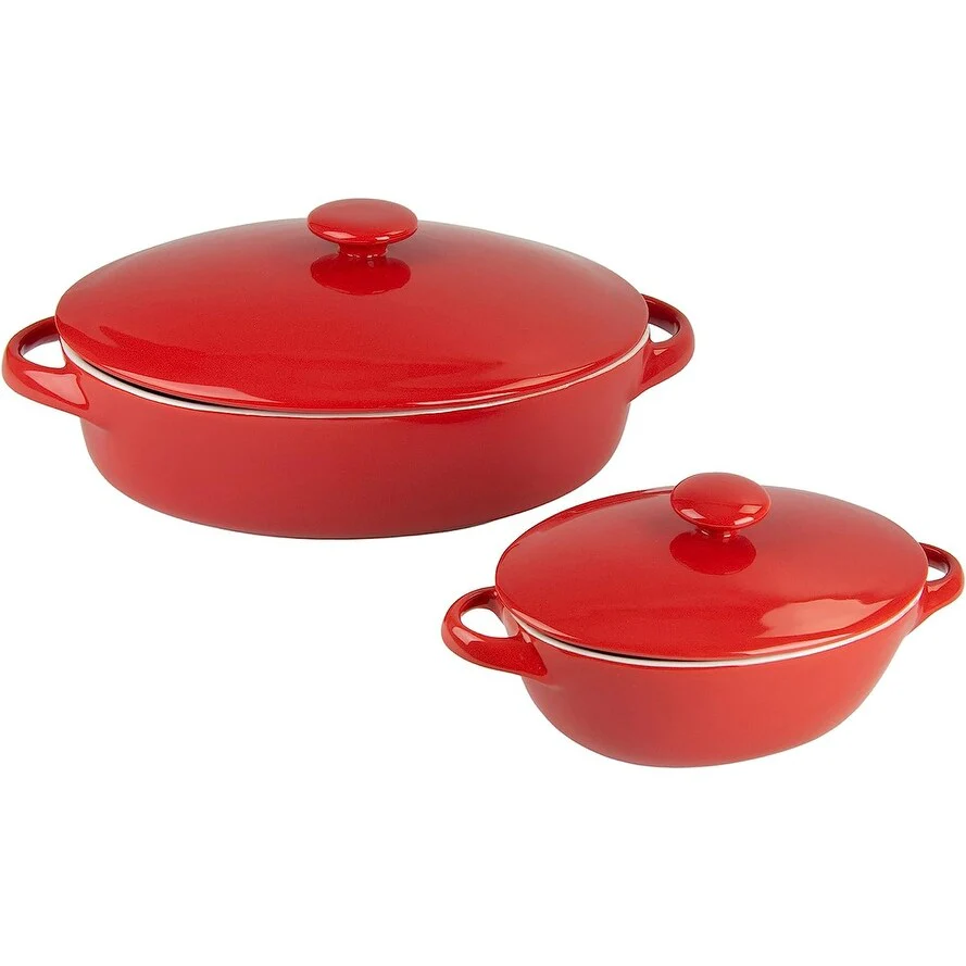 Prep, cook, serve, and store all in one container! This set of 2 covered casserole dishes is made of durable stoneware that is microwave, oven, and dishwasher safe and will not absorb odors or flavors, making them a must-have for every kitchen. Featuring a two-tone color scheme and knobbed lids, you’ll love baking your favorite dishes and serving your guests with this great bakeware set from 10 Strawberry Street.