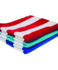 In bright summery colors, but with a luxurious velour feel, these 100 percent cotton striped beach towels will be the perfect accompaniment to a day at the shore or pool. Available in red, blue or turquoise, these towels offer versatility.
