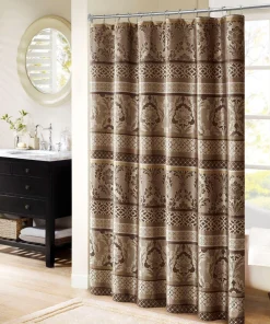 Indulge in an elegant bath with this jacquard woven shower curtain that adds a touch of vintage flair to your intimate space with its beautifully crafted ironwork patterned traditional stripe design. The top is carefully equipped with 12 grommets to ensure stable hanging, and it is suitable for a wide range of bathroom rods (not included), making it easy and quick to install. This 100% polyester jacquard shower curtain is machine washable and easy to care for. Â Â